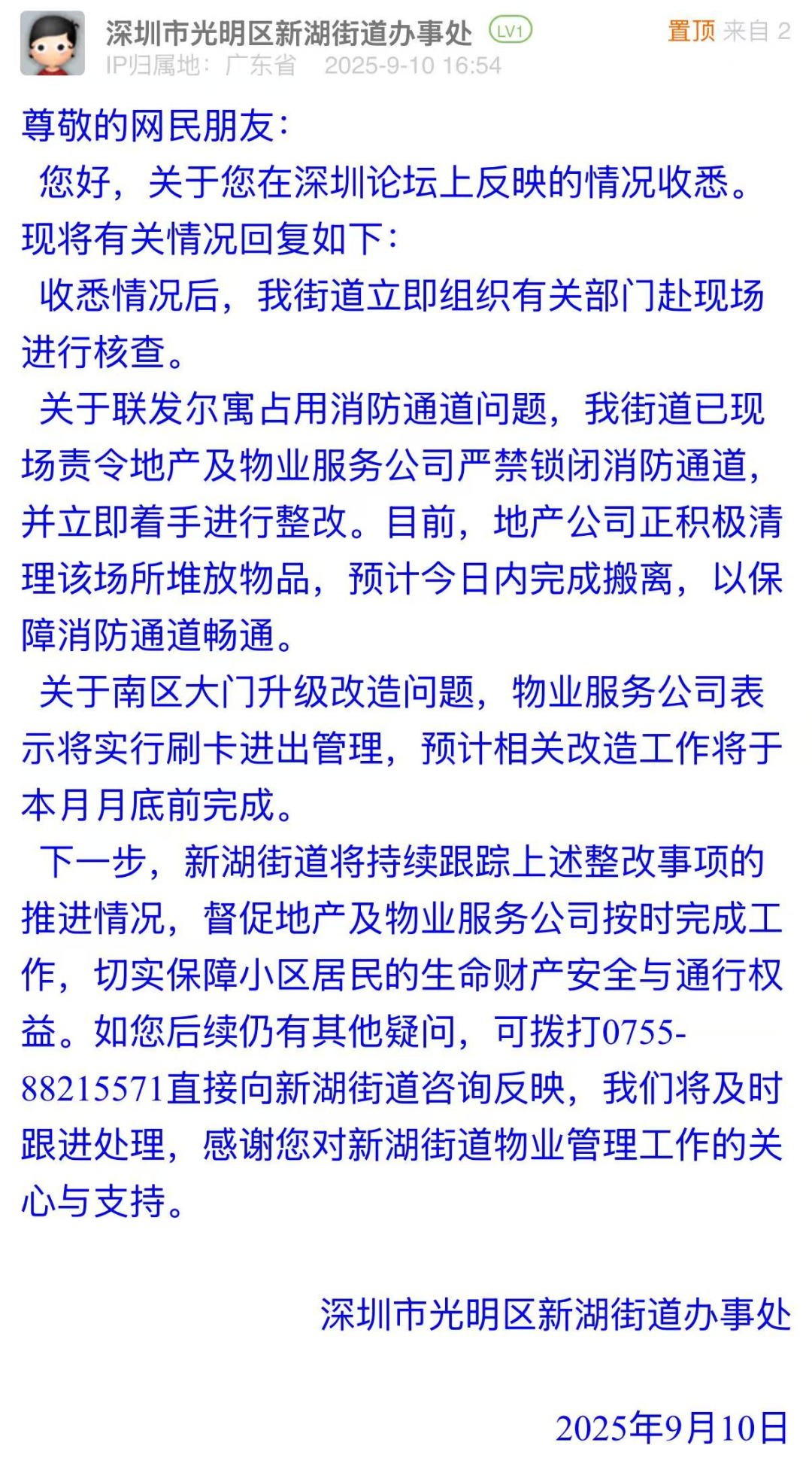 案例點評:消防通道是保障居民生命安全的“生命通道”,在突發(fā)狀況下肩負著關鍵作用。針對小區(qū)消防通道被違規(guī)占用這一安全隱患,新湖街道辦第一時間責令責任方整改,高效推動障礙物清理,暢通消防通道。對于市民小區(qū)大門升級改造的訴求,街道辦的回應明確了刷卡管理改造的時間節(jié)點,以實際行動推動安全隱患消除、提升小區(qū)管理品質(zhì),充分彰顯了基層治理的責任擔當與務實智慧。