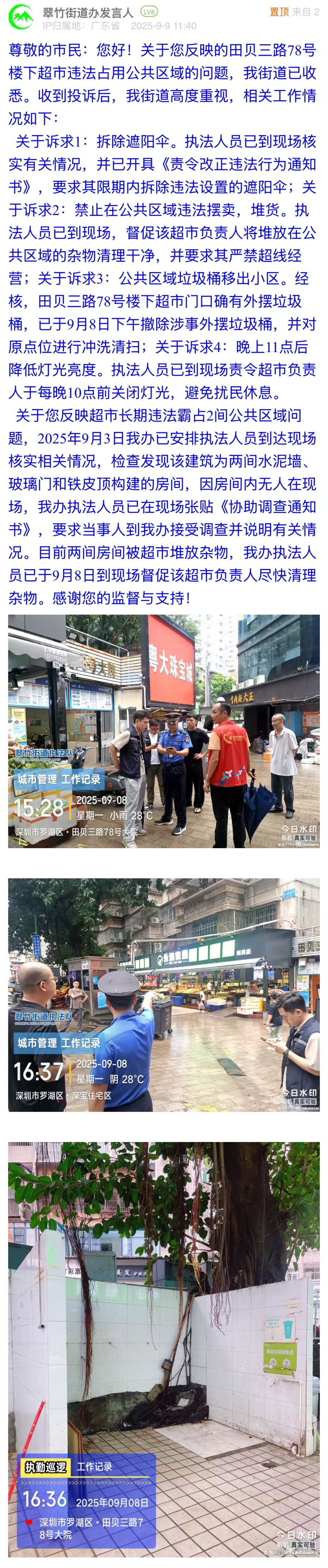 案例點評:本案例中,翠竹街道辦立足市民訴求,對違規(guī)搭建遮陽傘、占用公共區(qū)域、違規(guī)堆放垃圾、店面燈牌亮度過高這四個問題,街道均做到快速響應,并以圖片展示治理效果?;貞润w現(xiàn)了基層執(zhí)法的規(guī)范性與時效性,又展現(xiàn)了對民生細節(jié)的關注力,踐行了“小事不小辦、事事有回音”的理念,為同類民生訴求的解決提供了可借鑒范式。