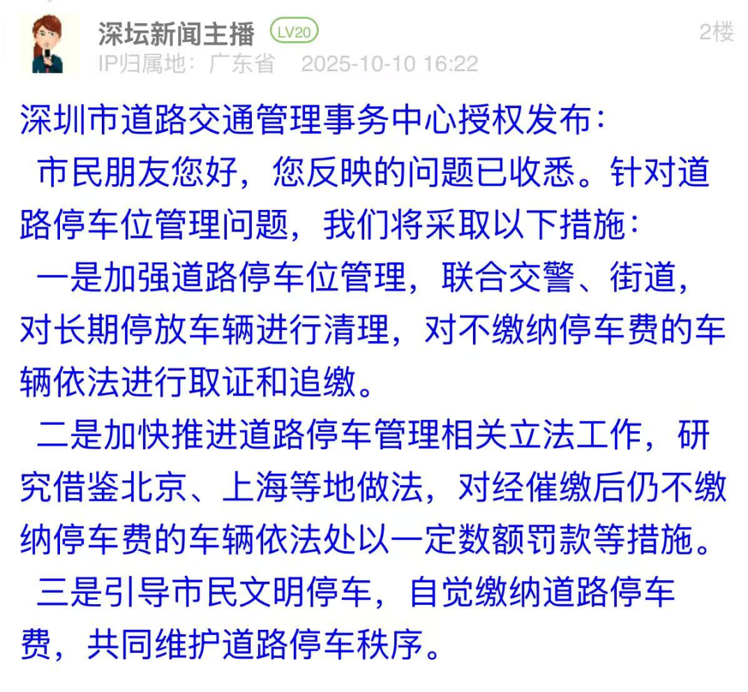 優(yōu)化建議:市民在帖文中反映,其此前的投訴件被標記為“辦結(jié)”,但霸位車輛依舊未被移走,現(xiàn)場問題未解決,質(zhì)疑相關部門執(zhí)行力不足。對于市民的再次投訴,深圳市道路交通管理事務中心的回應存在公式化、未切實回應市民核心關切的問題,僅以“加強管理”“推進立法”“引導文明停車”等回復,難以消除公眾對治理執(zhí)行力的疑慮。建議后續(xù)強化回應針對性,具體問題具體答復,如公開執(zhí)法流程、提供處置證據(jù)等,以務實態(tài)度回應市民監(jiān)督,提升治理公信力。