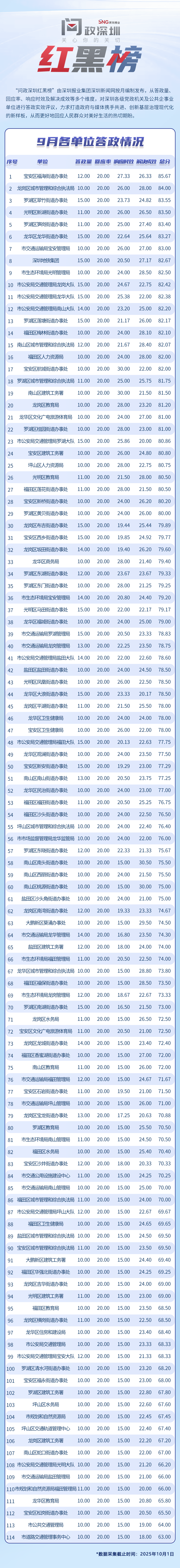 為探尋媒體如何精準賦能基層治理現(xiàn)代化的“深圳路徑”,深圳報業(yè)集團正式掛牌成立“問政深圳”工作室,旨在進一步推動網(wǎng)絡問政工作的高效開展。為確保相關工作更加契合實際需求,自上期起,深圳報業(yè)集團深圳新聞網(wǎng)按照“最快速度辦結(jié)”的總體要求,將原有月度榜單創(chuàng)新升級為“問政深圳紅黑榜”,并對評分體系進行了細致優(yōu)化。該榜單從答政量、回應率、響應時效及解決成效等多個維度,對深圳各級黨政機關及公共企事業(yè)單位進行答政實效評議,力求打造政府與媒體攜手共進、創(chuàng)新基層治理現(xiàn)代化的新樣板,從而更好地回應人民群眾對美好生活的熱切期盼。