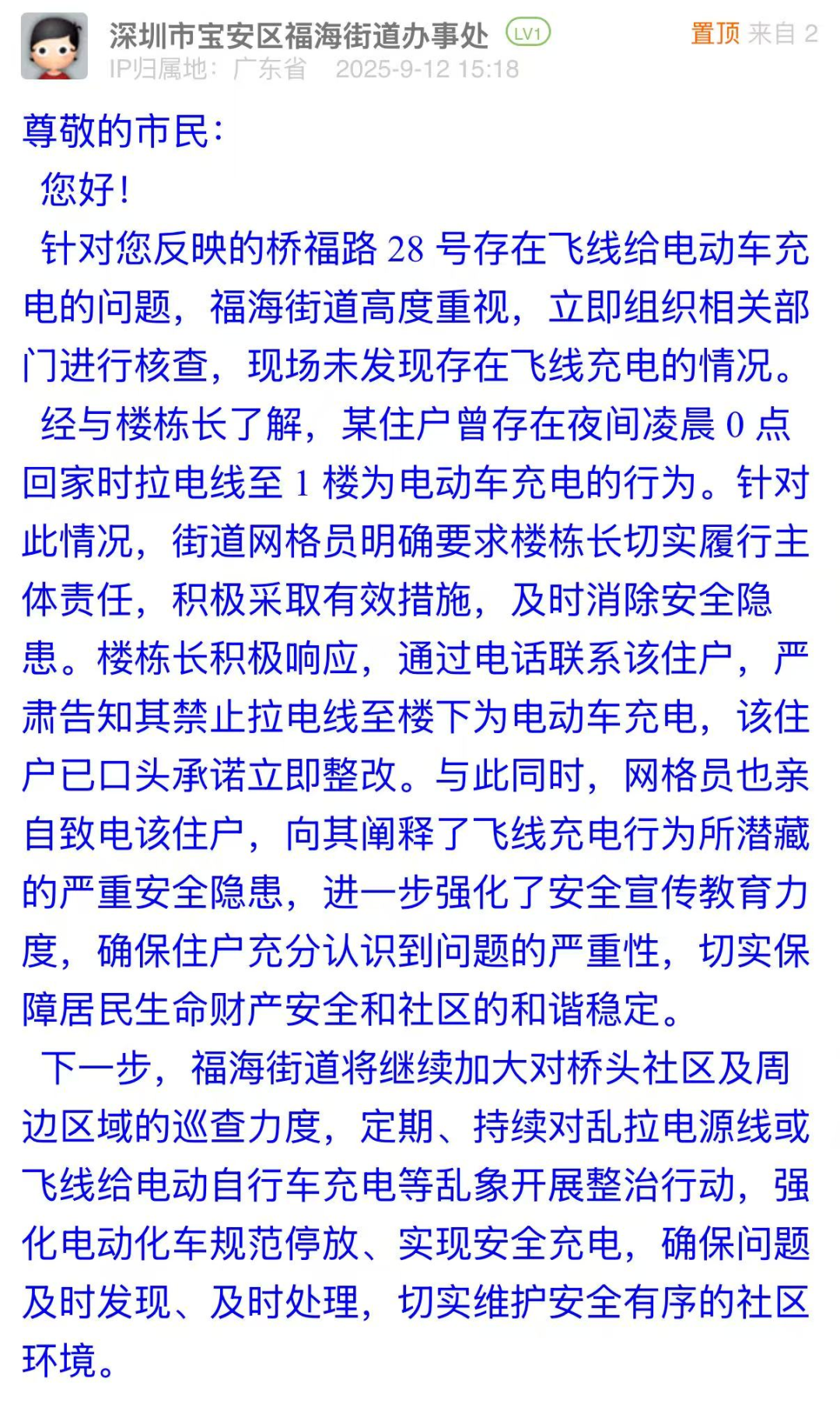 案例點評:福海街道辦對電動車“飛線充電”問題展現(xiàn)出快速響應、權責明晰的治理態(tài)度,第一時間組織核查,既明確主體責任、嚴令整改,又細致開展安全教育,讓住戶充分認知“飛線充電”的嚴重危害,體現(xiàn)執(zhí)法和普法的雙重擔當?;貞校值擂k還表示將強化巡查力度、開展整治行動,建立長效治理機制,維護社區(qū)安全秩序,彰顯了基層治理中“問題導向、標本兼治”的治理邏輯。