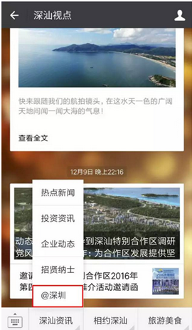 入駐的黨政自媒體:之前入駐的深圳發(fā)布、市交委、公安發(fā)布、政協(xié)、民政、公積金管理中心、市質監(jiān)、工務署、司法、衛(wèi)計委、口岸辦、人社、文博會之外,近期入駐的大V伙伴還有深汕視點、深圳通等。各區(qū)(新區(qū))官方微信公眾號均組團入駐。
