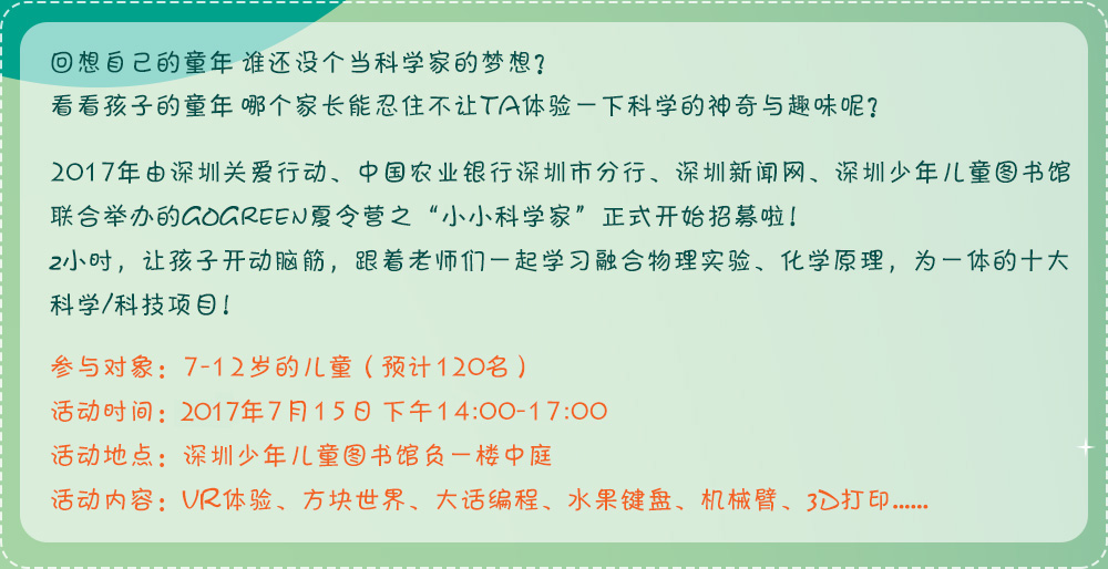 GO GREEN綠色夏令營之“小小科學(xué)家”活動由深圳市關(guān)愛辦、中國農(nóng)業(yè)銀行深圳市分行、深圳新聞網(wǎng)、深圳市少年兒童圖書館聯(lián)合舉辦。2個小時(shí)的活動,讓孩子開動腦筋,跟著老師學(xué)習(xí)融合物理實(shí)驗(yàn)、化學(xué)原理,為一體的十大科學(xué)/科技項(xiàng)目。[詳細(xì)]